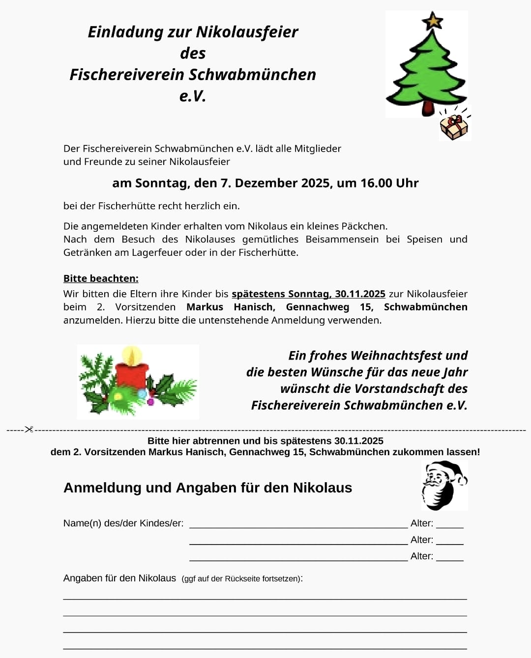 Hiermit wollen wir alle Mitglieder und Freunde am Sonntag dem 7.12.2025 zur Waldweihnacht an der Fischerhütte einladen.